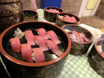 ボウリングの後はお待ちかねのビアパーティーです。コース料理の他にお寿司の屋台も用意され美味しい料理に舌鼓を打ちました。